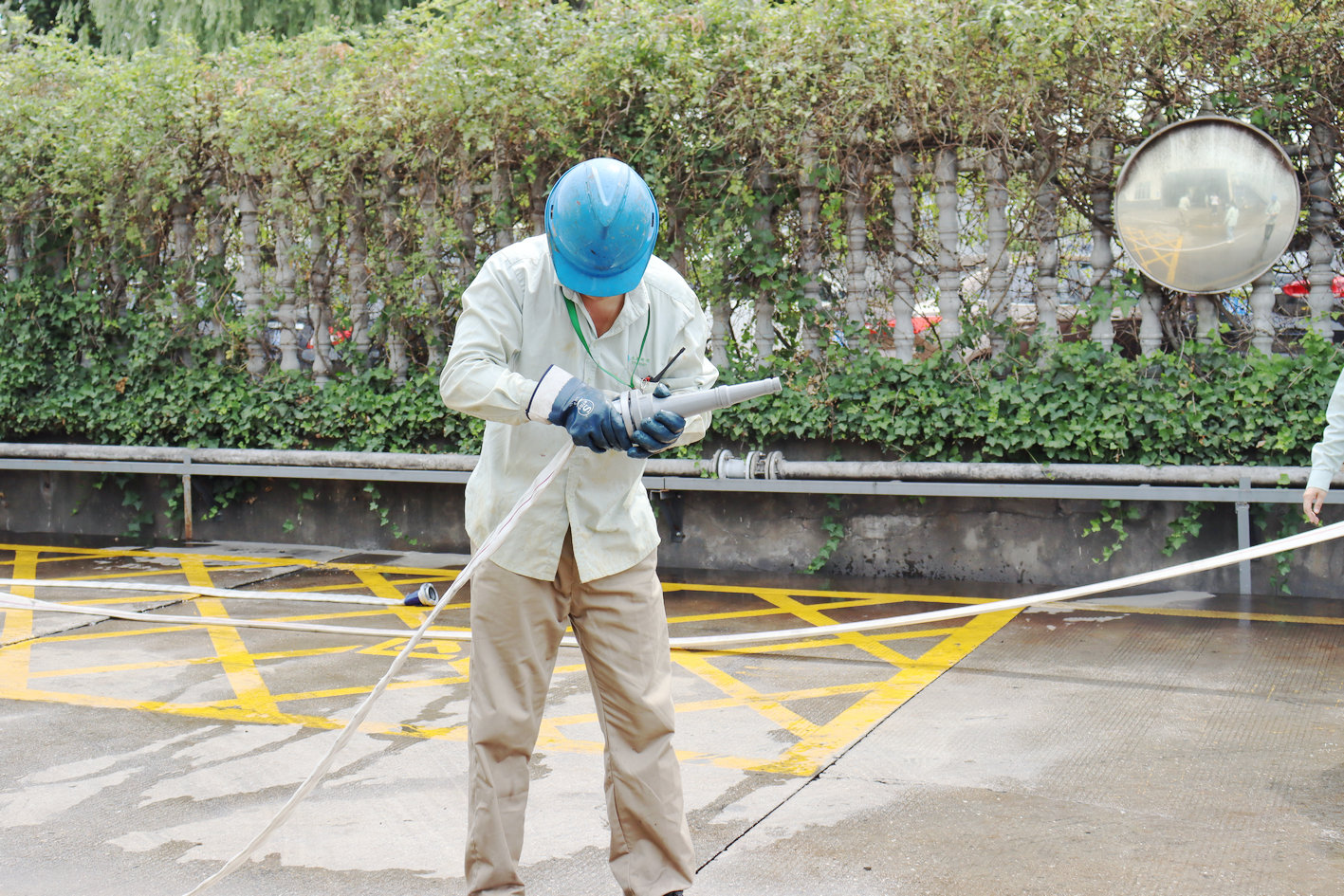 第二個項目是單人滅火比賽“烈火英雄”。50米的比賽場地分兩條賽道,設置起火點兩處,在最短的時間內使用4公斤干粉滅火器將各自賽道內的火焰撲滅者為優勝。南北廠區分為兩大組,捉對競技。一時間,火焰翻騰,濃煙滾滾,我們的參賽隊員似利箭離弦,眨眼之間將火焰撲滅。現場不時爆發出陣陣加油聲和歡呼聲,不斷為參賽的同事加油打氣。