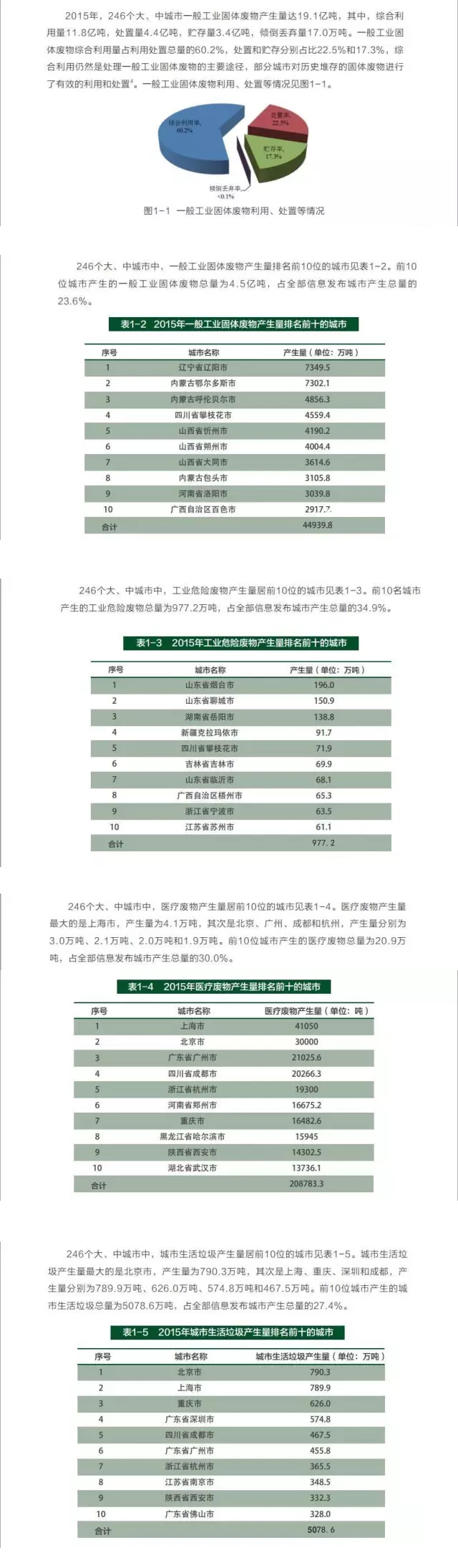 2015年,全國(guó)共有246個(gè)大、中城市向社會(huì)發(fā)布了固體廢物污染環(huán)境防治信息。此次發(fā)布信息的大、中城市一般工業(yè)固體廢物產(chǎn)生量為19.1億噸,工業(yè)危險(xiǎn)廢物產(chǎn)生量為2801.8萬(wàn)噸,醫(yī)療廢物產(chǎn)生量約為68.9萬(wàn)噸,生活垃圾產(chǎn)生量約為18564.0萬(wàn)噸。